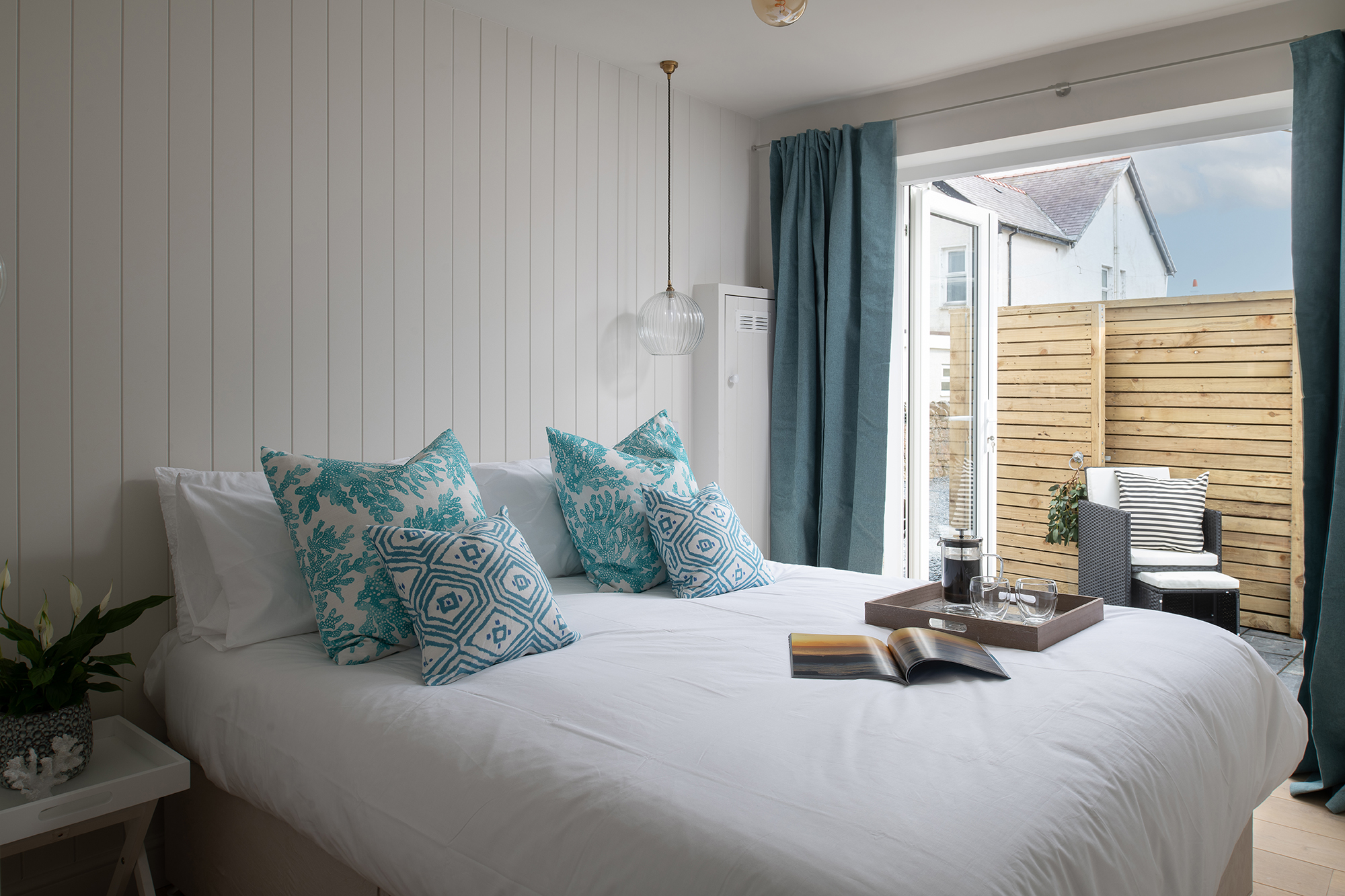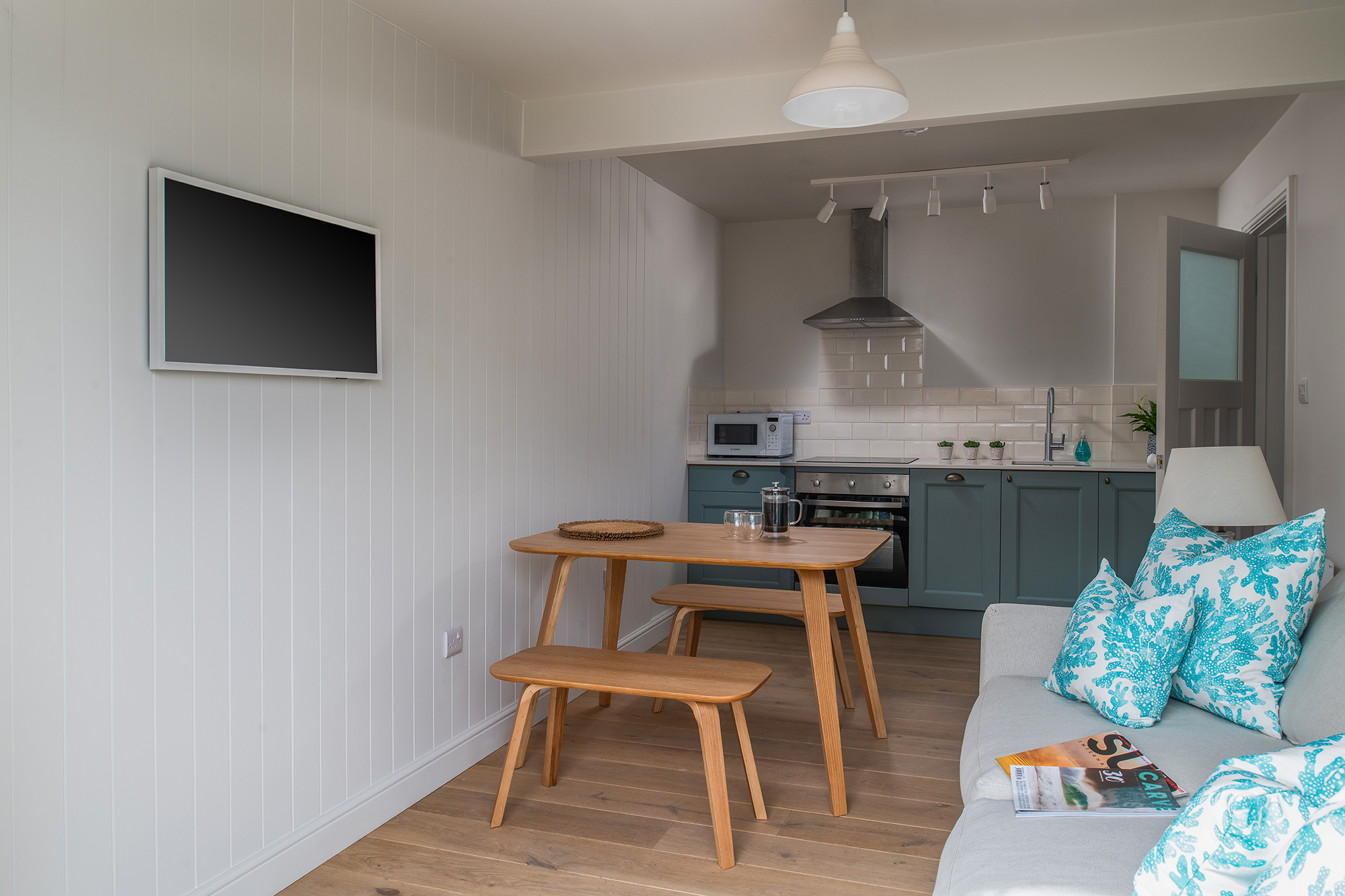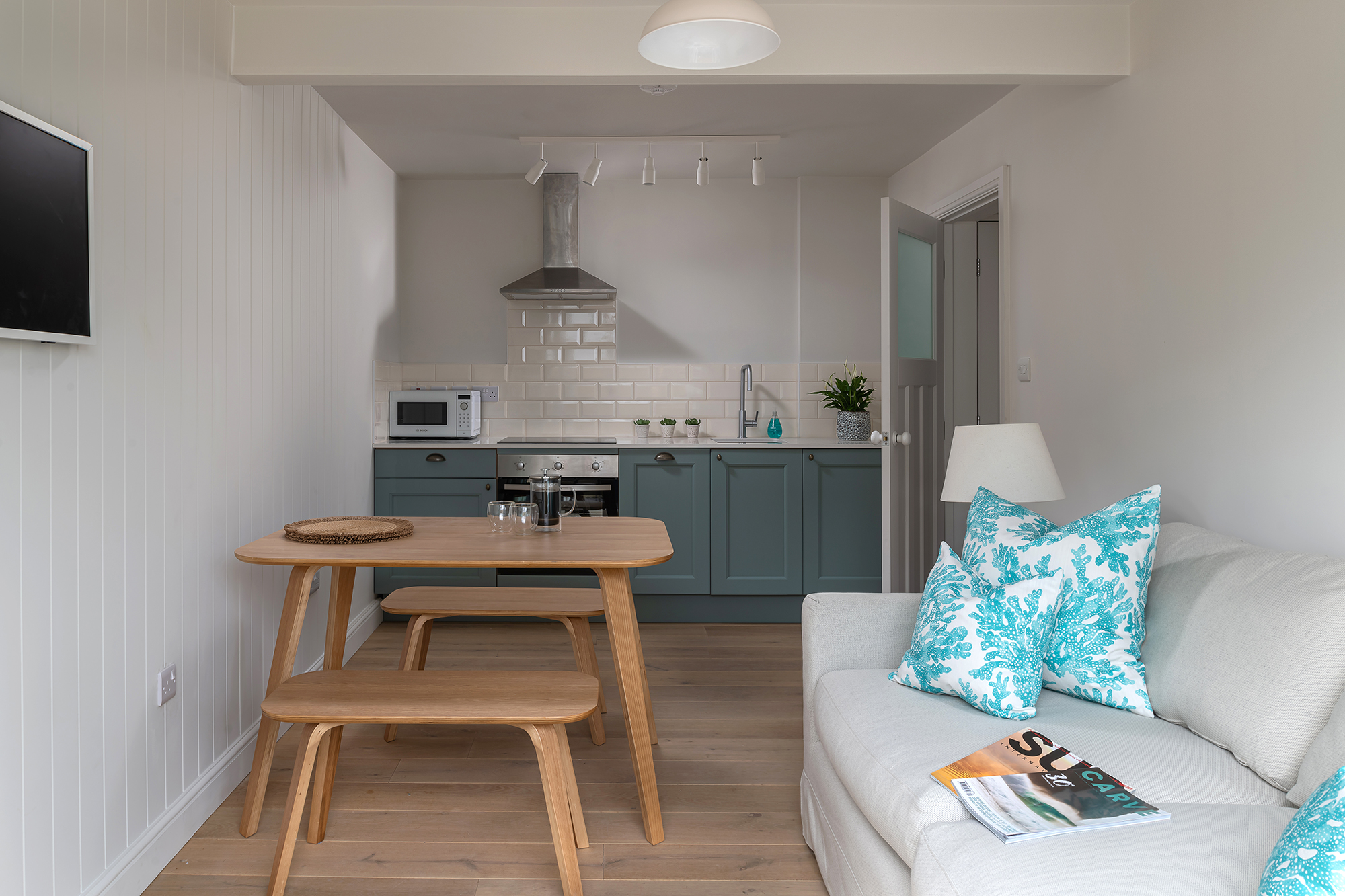 Wave, this ground floor apartment is ideal for up to four guests offering a retreat by the sea. The bedroom features a versatile zip link king-sized bed giving the option for two single beds, while a double sofa bed in the living area provides additional sleeping space for friends and family.